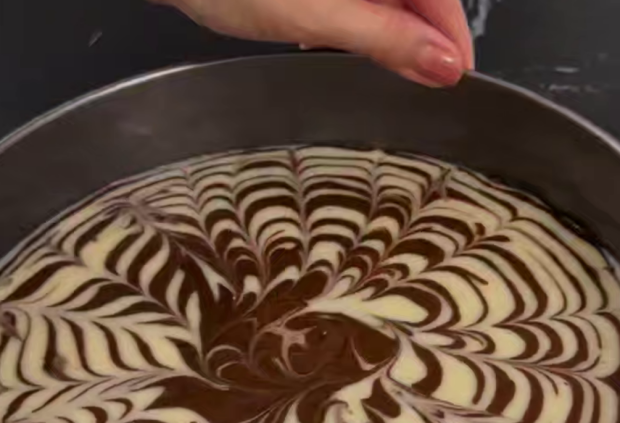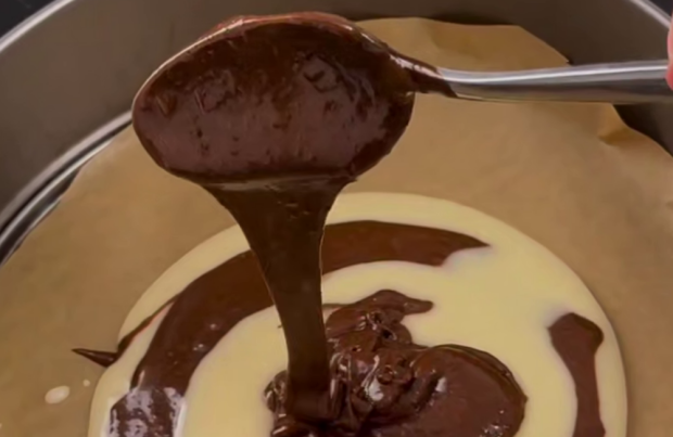 В форму для выпечки выкладывайте тесто слоями: две столовые ложки белого теста, затем ложку шоколадного. Чередуйте слои до окончания теста — это и создаст эффект "зебры".