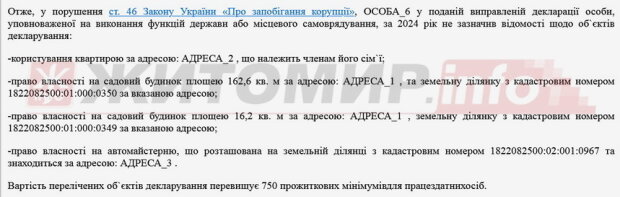 Эти участки и два садовых домика фактически образуют одно домовладение в селе Заричаны — что подтверждается кадастровыми номерами. Следствие также доказало: именно Кузьменко организовывал стройку, финансировал работы и является реальным владельцем всей этой недвижимости. Однако в ежегодной декларации за 2024 год он эти активы не указал.