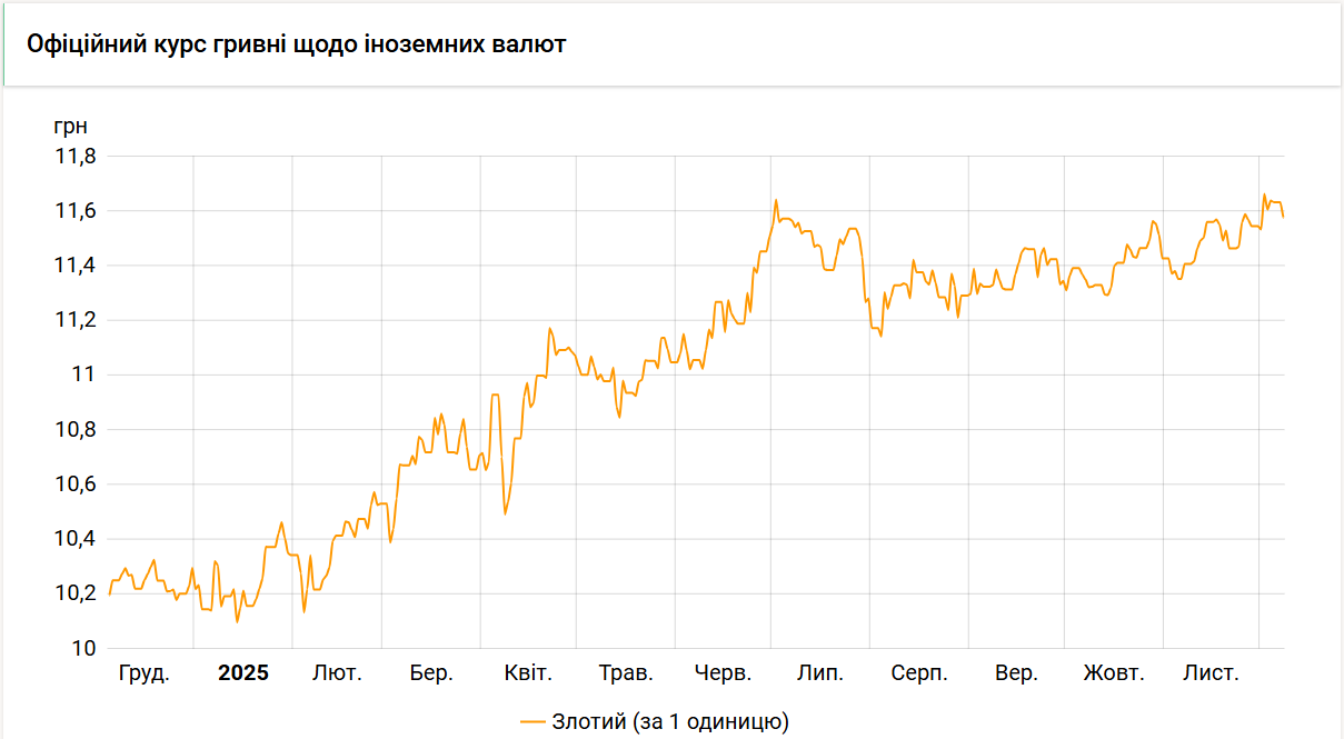 Официальный курс на 8 декабря 2025 года установлен на таком уровне: 11,5763 гривен за 1 злотый (-0,06 грн).