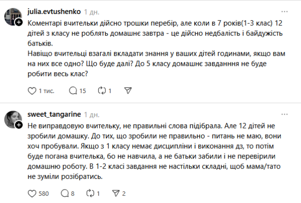 "Не оправдываю учительницу, не правильные слова подобрала. Но 12 детей не сделали домашку. К тем, что сделали не правильно - вопросов не имею, они хоть пробовали. Если с 1 класса нет дисциплины и выполнения дз, то потом будет плохая учительница, потому что не научила, а не родители забили и не проверили домашнюю работу. В 1-2 классе задания не настолько сложны, чтобы мама/папа не сумели разобраться."