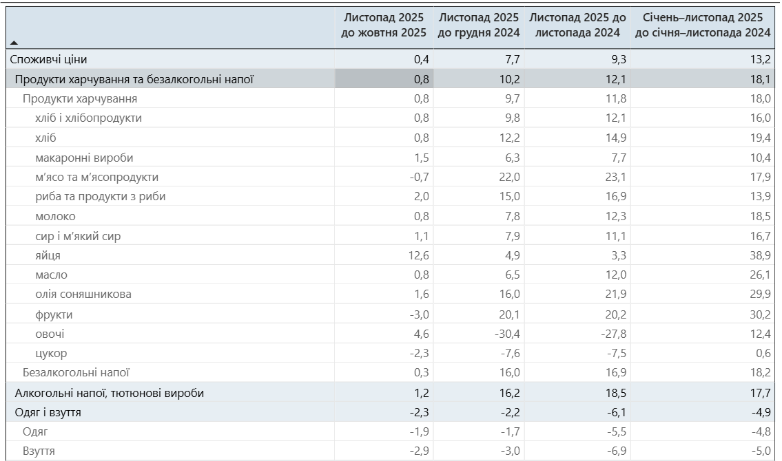 Инфляция на потребительском рынке в ноябре 2025 года составила 0,4% по сравнению с октябрем. В годовом измерении (к ноябрю 2024 года) рост цен составил 9,3%. Такой же уровень зафиксирован и для базовой инфляции.