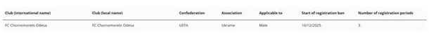 Следовательно с сегодняшнего для пополниться новыми игроками клуб из Одессы не сможет на протяжении полутора лет - до лета 2027 года.