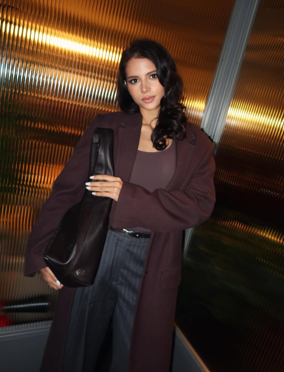 Мягкая округлая линия сумки контрастирует с геометричностью пальто, создавая баланс между строгостью и женственностью. Темный ремень на талии помогает очертить силуэт, несмотря на то что верхняя часть образа достаточно объемная.
