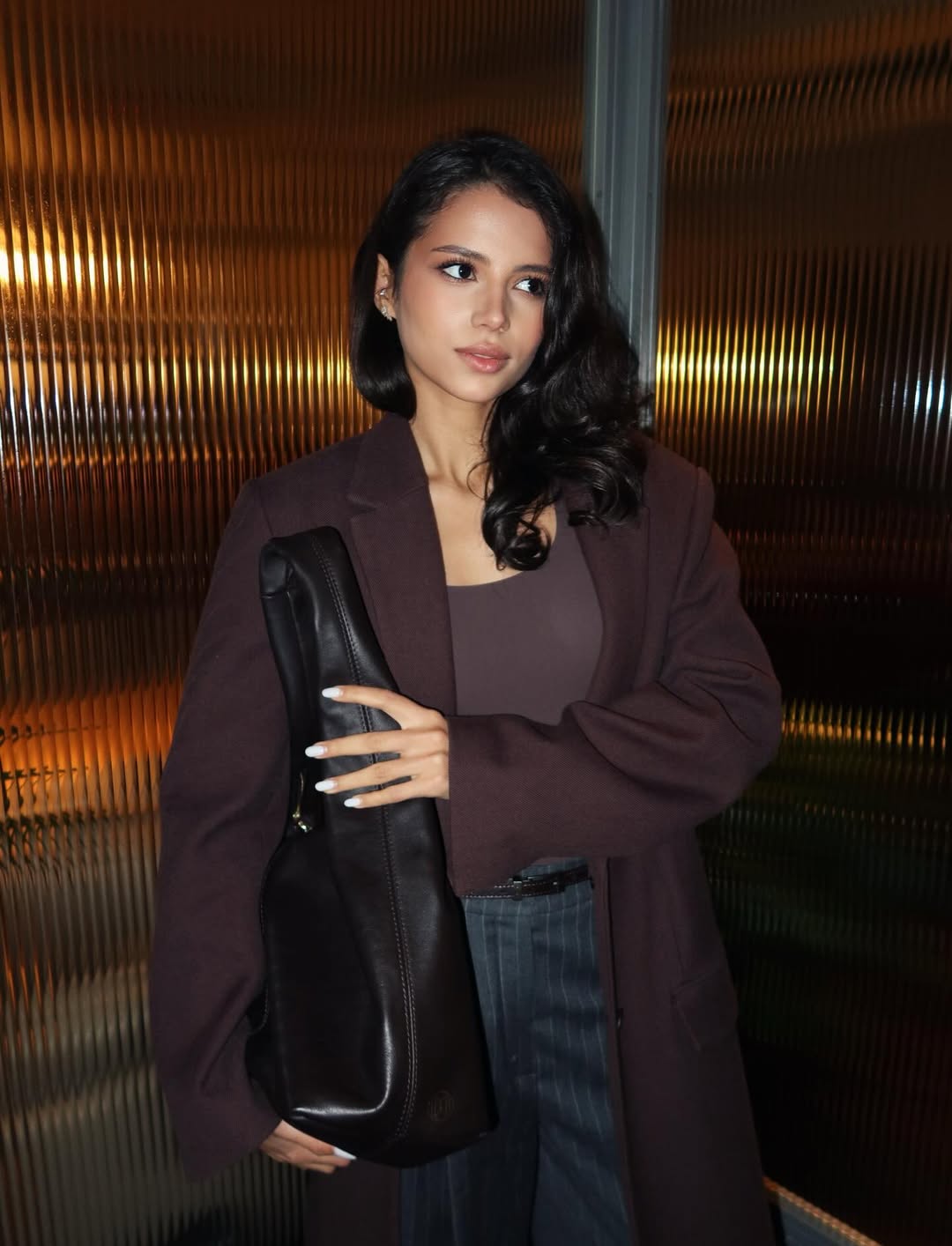 София Шамия демонстрирует стиль, в котором можно появиться и на деловой встрече, и на вечерней прогулке по городу. Такой образ - универсальный пример того, как коричневый цвет и классические брюки с полоской могут работать вместе в современном городском гардеробе.