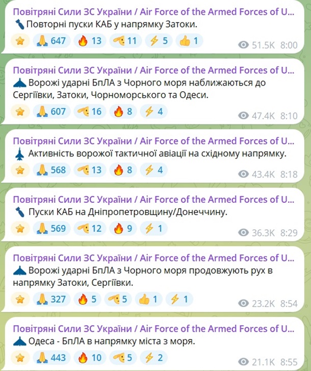 По данным военных, враг направлял ударные беспилотники в сторону Затоки и Черноморского, а также осуществлял сброс управляемых авиабомб в направлении Затоки.