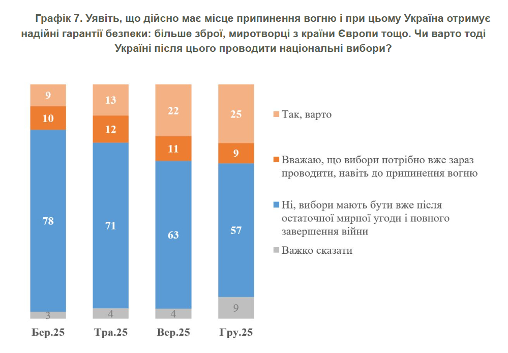 Вместе с этим большинство – 57% (в сентябре – 63%) – продолжают настаивать, что выборы возможны лишь после окончательного мирного соглашения и полного завершения войны .