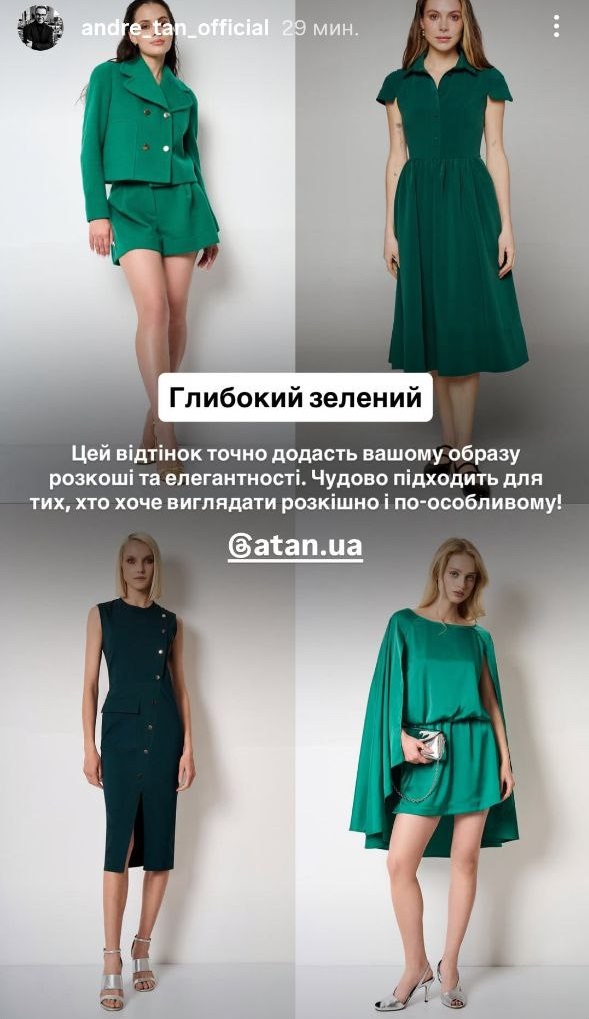 Отдельно Андре Тан отмечает зеленый цвет, который традиционно символизирует роскошь, баланс и элегантность. Зеленый может стать удачным выбором для тех, кто стремится к праздничному виду без чрезмерной яркости, но с чувством статусности.