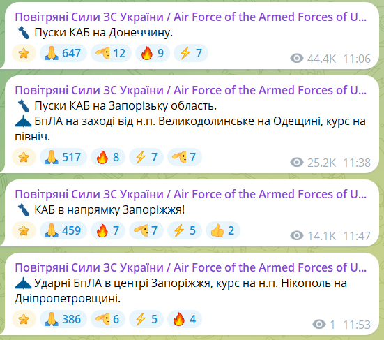 В области сейчас продолжается воздушная тревога. Воздушные силы в своих аккаунтах в соцсетях предупреждают о вражеских КАБах и дронах, которые летят на Запорожье