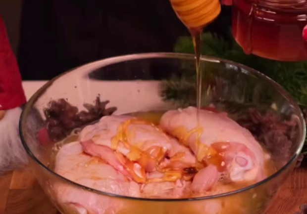 Готовится всё по-праздничному неторопливо. Курицу складывают в глубокую миску, выжимают сок одного апельсина и добавляют мёд, соевый соус, оливковое масло, соль и перец.