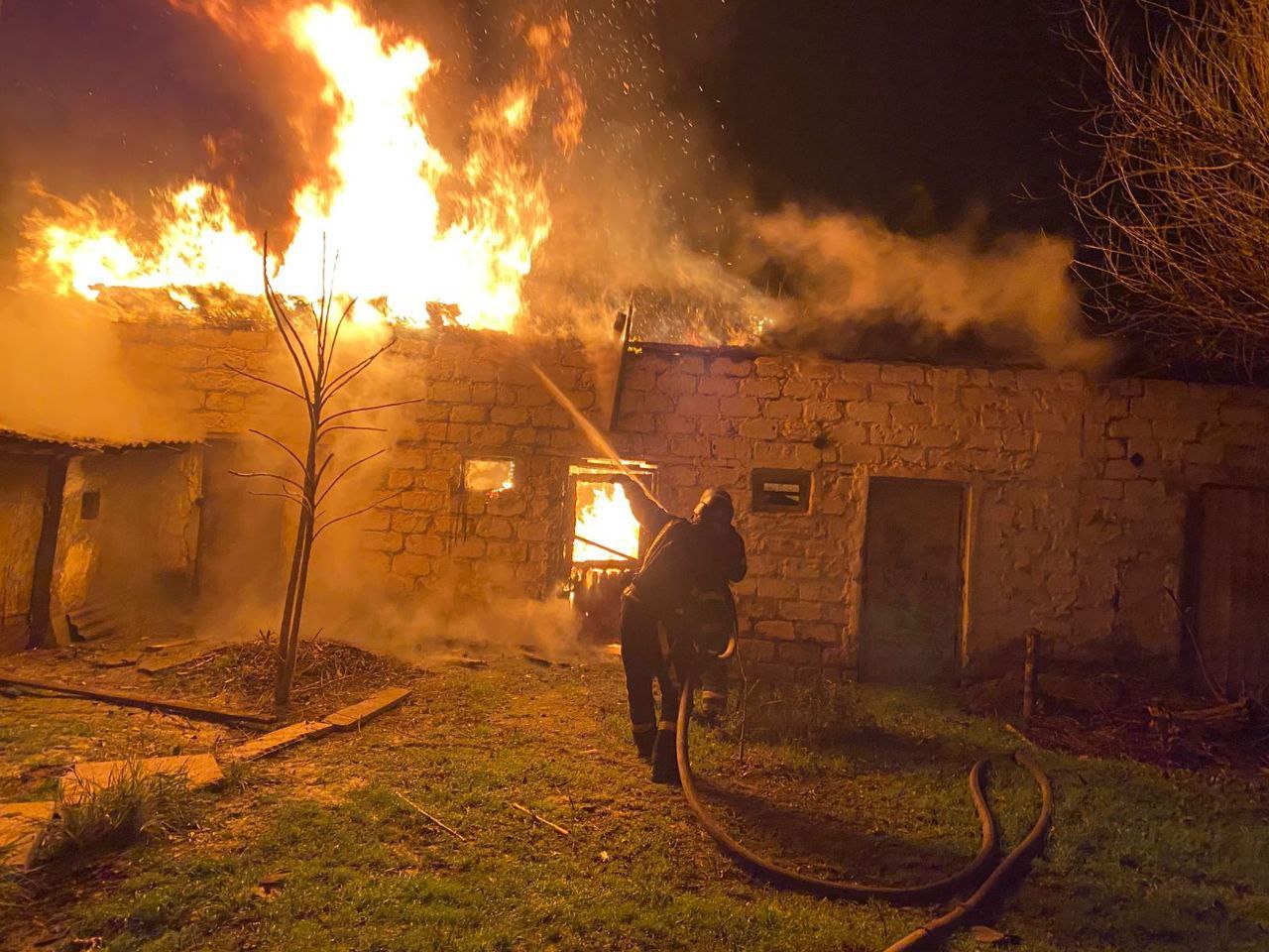 Загорелись хозяйственные постройки. Побитны частный дом, пять двухэтажных домов, админздание и здание заведения культуры, гаражи.