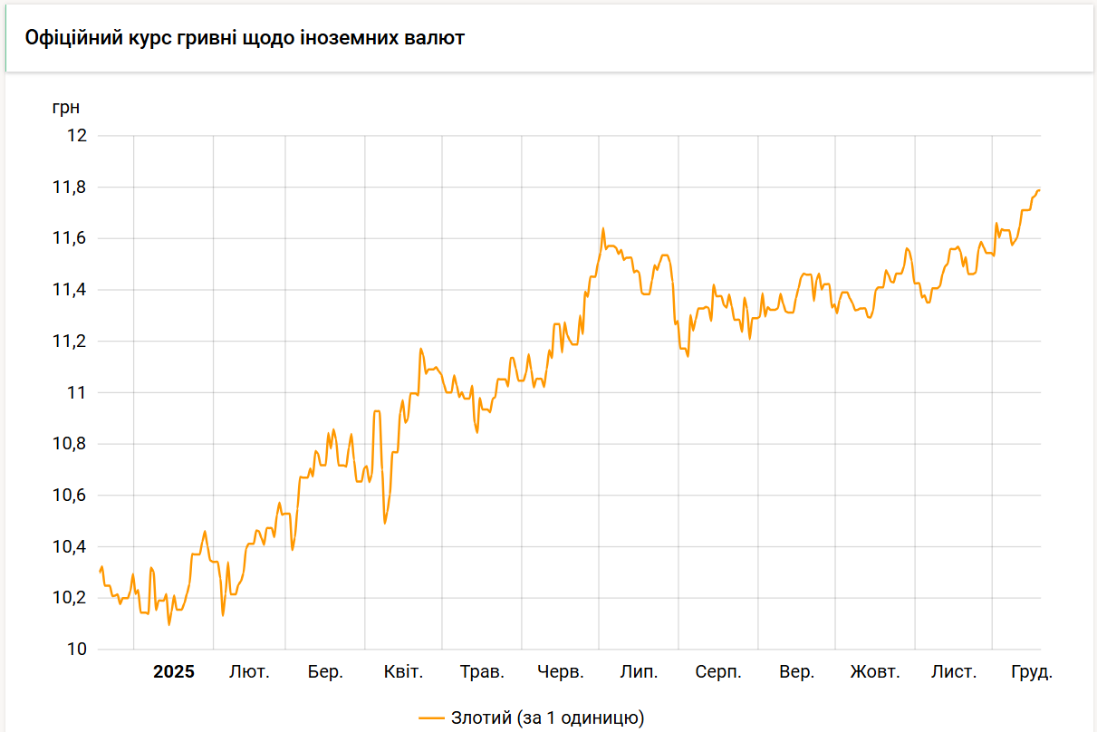 Официальный курс на 19 декабря 2025 года установлен на таком уровне: 11,7905 гривен за 1 злотый (без изменений с предыдущим днем).