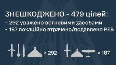 Early data shows that as of 10:30, Ukrainian air defence had destroyed 479 Russian aerial targets, 292 of which were shot down and 187 disappeared from radar: