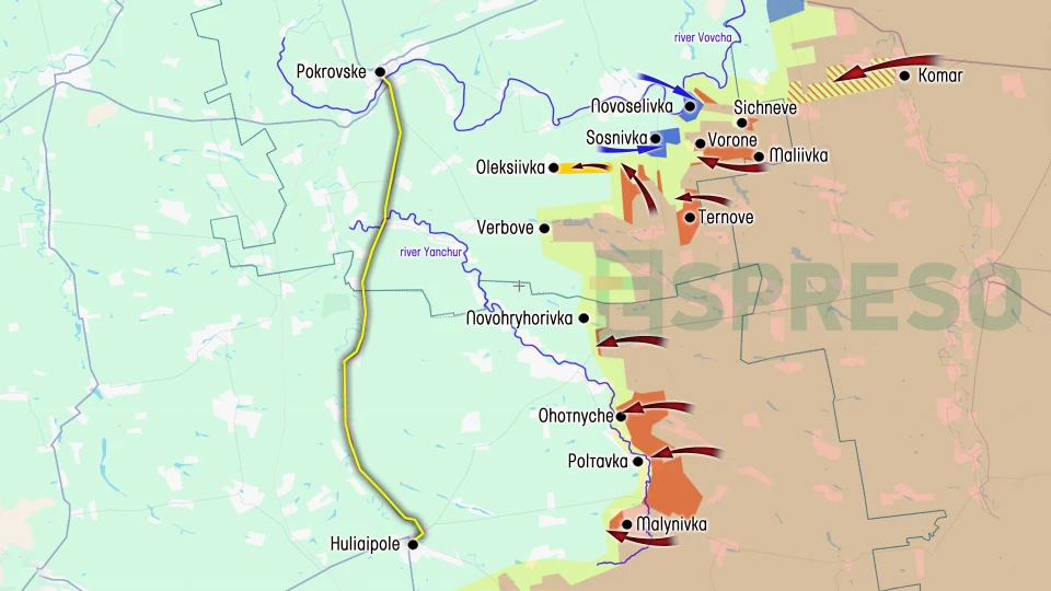 Ukraine Russia war live map, October 4-11, photo: EspresoFurther south, Putin’s forces finally captured Maliivka, Vorone, and Ternove. Using the cover of fog, they entered Oleksiivka but have been unable to consolidate their positions there. Meanwhile, the Ukrainian Armed Forces managed to halt the occupiers in Verbove and maintain their defenses. Russia’s main objective is to continue advancing westward between the Vovcha and Yanchur rivers to cut the Pokrovske–Huliaipole highway, a key route for Ukraine’s logistics.Looking further south, where the Dnipropetrovsk region transitions into the Zaporizhzhia region, Russian forces in most areas have stopped on the left bank of the Yanchur River and are attempting to cross it. This situation has developed particularly near Poltavka and Okhotnyche. In Malynivka, however, Russian troops established positions on the right bank back in 2022 and this week managed to advance into the village, almost completely occupying it. Currently, only Novohryhorivka remains under Ukrainian control on the left bank of the Yanchur River in Zaporizhzhia, where heavy fighting continues.The maps were created based on information received from the Ukrainian Armed Forces’ General Staff, as well as from other open and verified sources. At the same time, the maps are not maximally precise and only conventionally reflect trends in the combat zone.