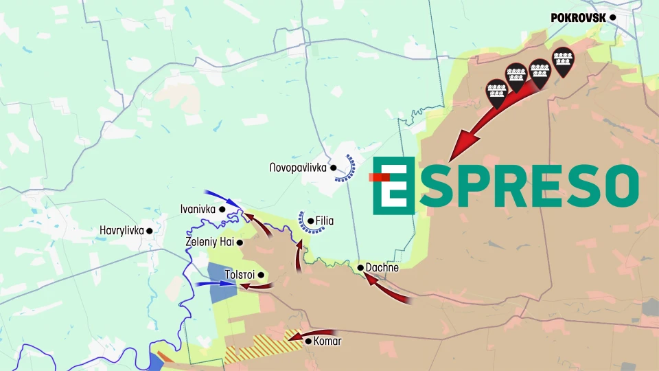 Ukraine Russia war live map, October 4-11, photo: EspresoRivers as defensive barrier against Russian advances in Zaporizhzhia, Dnipropetrovsk regionsIt has been more than two months since the Russian offensive in the Novopavlivka direction, in the Dnipropetrovsk region, effectively came to a halt. The occupying forces failed to reach Ukraine’s fortified area located 7 km to the east and 8 km to the south, where the Vovcha River has become a natural defensive line. Although they continue attempts to cross the river and enter the villages of Dachne, Filiya, and Ivanivka, they have been unable to gain a foothold. With the onset of rains, crossing the river will become even more difficult.Further south, Russian troops also failed to capture Zelenyi Hai and Tolstoi or eliminate Ukraine’s salient in the Komar area, which they surrounded at the end of July. Their ongoing attempts to advance, combined with a shortage of manpower, prevent them from seizing the Ukrainian bridgehead on the left bank of the Vovcha River.That is why the Russian Armed Forces transferred as many as four motorized rifle brigades from the Pokrovsk front to the Novopavlivka direction, aiming to finally push the front line forward and dislodge the Ukrainian Armed Forces from the left bank of the Vovcha River.Meanwhile, in late September and early October, Ukrainian Defense Forces launched their first major counteroffensive in the Dnipropetrovsk region, clearing the villages of Sosnivka, Khoroshe, and Novoselivka, and liberating Sichneve. However, Russia later counterattacked, retaking part of Sichneve and fortifying positions in the ravine stretching from Sichneve to Novoselivka.