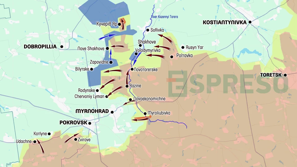 Ukraine Russia war live map, October 4-11, photo: EspresoWho is implementing Dobropillia gambitUkraine’s Commander-in-Chief Oleksandr Syrskyi once again personally visited the Pokrovsk front, where the situation remains extremely tense. Russian forces continue their offensive on Rodynske and Bilytske. Further south, they have built on previous gains and advanced from Myroliubivka toward Myrnohrad. Daily assaults persist in Novoekonomichne, and Krasnyi Lyman is increasingly falling under Russian control. Notably, surrounded Russian units are refusing to surrender and are attempting to break out — not to the east, but to the west — continuing their line of attack. Some are striking toward Nove Shakhove, while others are trying to regain control of Kucheriv Yar. These efforts are coordinated with simultaneous assaults on Volodymyrivka, Shakhove, and Sofiivka. A large portion of the armored vehicles destroyed in recent days were involved in fighting in this area.At the same time, Ukrainian Defense Forces continue to hold Zapovidne and Mayak, successfully repelling paratrooper attacks on Volodymyrivka while advancing toward Novotoretske. Ukrainian troops still have the opportunity to encircle and eliminate not only the occupiers advancing toward Dobropillia but also those recklessly attacking Rodynske. After all, these assaults have persisted for two months — and Russia’s resources are far from limitless.