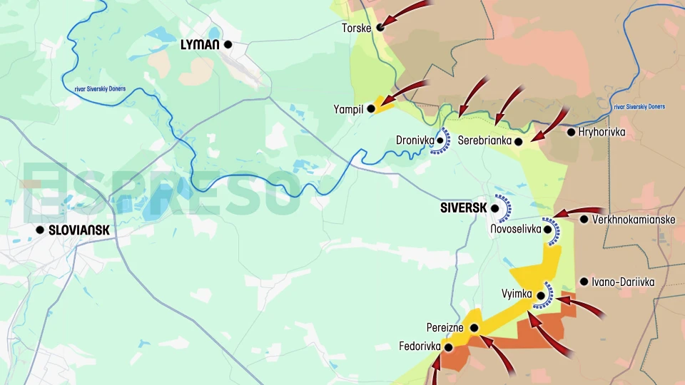 Ukraine Russia war live map, October 4-11, photo: EspresoSiversk in circular defenseAfter Putin’s forces occupied the entire coast of the Siverskyi Donets River north of Siversk and began storming Yampil and Dronivka, they shifted their focus south of the city, attacking in the Vyimka and Fedorivka areas. Most of Fedorivka has fallen under the control of the occupying forces, who also advanced northward in the Pereizdne area. South of Vyimka, Russian forces moved about 3 km toward the village, while north of it they managed to create a 4 km corridor through which they aim to encircle the settlement and force the Ukrainian Defense Forces to abandon their defensive positions established since 2023. Siversk itself, which has remained Ukraine’s easternmost stronghold since the start of the war, lies mainly on the left bank of the Bakhmutka River. These are the very areas Russian troops are now targeting, approaching the city from three directions.Meanwhile, anticipating further developments, Ukraine’s General Staff renamed the Siversk direction to Sloviansk, recognizing that preparations for the city’s defense must begin now.