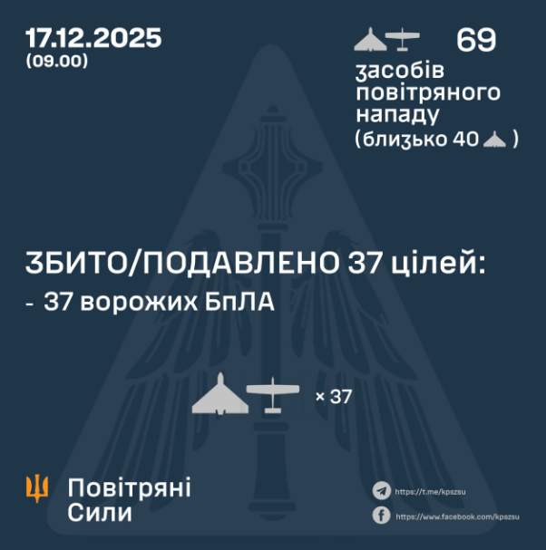 According to preliminary data, as of 09:00, air defenses shot down/suppressed 37 enemy Shahed, Gerbera UAVs and drones of other types in the north, south, and east of the country.