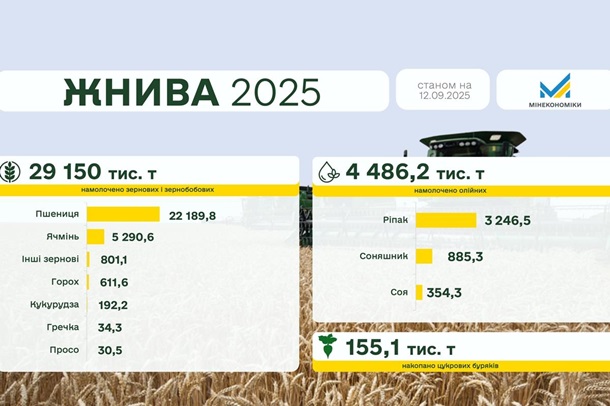 В Україні аграрії вже намолотили 29,15 млн тонн зернових та зернобобових культур на площі 7 007,9 тис. га, обмолочено 62% площ. Про це повідомила пресслужба Міністерства економіки, довкілля та сільського господарства в п'ятницю, 12 вересня.
