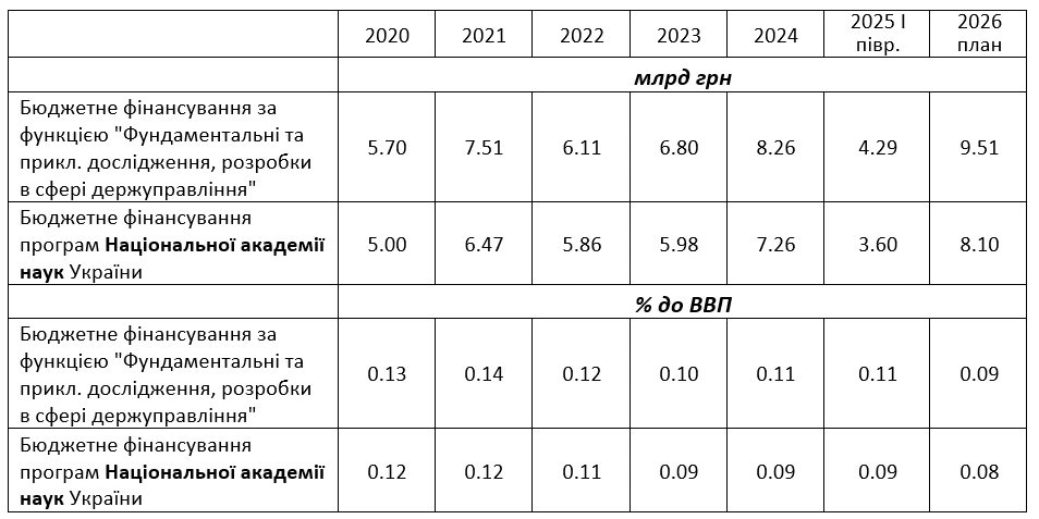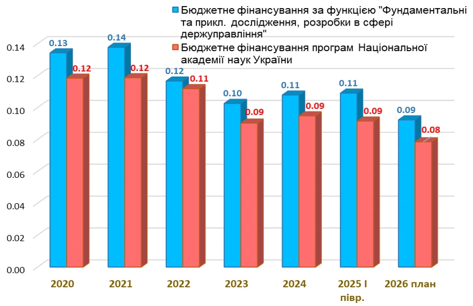 Джерело: Дані Мінфіну і Держстату УкраїниНа 2026 рік бюджетне фінансування НАН України планується в сумі 8,1 млрд грн, а з урахуванням діяльності галузевих академій наук – 11,1 млрд грн. Додатково передбачається виділити 0,9 млрд грн Національному фонду досліджень і 6,3 млрд грн на підтримку пріоритетних наукових досліджень і розробок закладів вищої освіти, стимулювання найкращих наукових установ, а також на виконання державного замовлення на найважливіші науково-технічні (експериментальні) розробки та науково-технічну продукцію.Європейська комісія в аналітичному звіті з оцінки заявки України на членство в ЄС із зверненням до Європарламенту і Європейської Ради констатувала, що діяльність з досліджень та інновацій в Україні, як і потенціал технологічної абсорбції, є обмеженими внаслідок хронічного недофінансування, неефективних механізмів розподілу бюджетних коштів і фрагментованого управління. У звіті зазначається, що в Україні кількість вчених скорочується, а їх відтік значно перевищує приплив. Існує нагальна потреба в розробці стратегії утримання та залучення талантів до сфери НДіР, заходів з підтримки кар'єри дослідників, а також в масштабних інвестиціях в дослідницьку інфраструктуру. Без вжиття нагальних заходів триватимуть процеси виїзду наукових кадрів за кордон, працевлаштування вчених у інших сферах, втрати перспективних наукових шкіл і розформування наукових колективів, фізичного і морального зносу матеріально-технічної бази наукових установ.На мій погляд, формування сучасної та збалансованої системи фінансування сфери НДіР та інновацій, а також піднесення ролі НАН України у вирішенні завдань науково-технічного і соціально-економічного прогресу потребує:Зосередження фінансових ресурсів держави на пріоритетних напрямах розвитку науки і техніки, оптимізації мережі державних наукових установ за результатами об’єктивного оцінювання ефективності їх діяльності. Лише концентрація фінансово-економічних ресурсів на пріоритетних напрямах розвитку науки із залученням конкурентоздатних установ до їх реалізації дозволить забезпечити відновлення і розвиток інноваційної системи країни.Реформуванням діяльності НАН України та галузевий академій при збільшенні бюджетного фінансування сфери НДіР до рівня 0,7-0,8% ВВП; виділення адекватних ресурсів на оновлення матеріально-технічної бази життєздатних наукових установ та гідну оплату праці дослідників. Посилення кадрового потенціалу сфери НДіР можливе лише при створенні фінансових стимулів до продуктивної праці дослідників. Підвищення соціального статусу та престижу їх роботи в суспільстві має відбуватися на фоні відкритості української науки та популяризації її досягнень серед широких верств населення.Вдосконалення структури і введення нових механізмів фінансування НАН України, зокрема створення чітких алгоритмів розподілу базового фінансування між установами НАН; збільшення частки конкурентного фінансування; забезпечення відбору на основі чітких критеріїв наукових проектів в рамках цільових державних програм; запровадження міжнародно визнаних критеріїв і стандартів організації/ замовлення наукових досліджень; проведення відкритої експертної оцінки та обговорень науково-дослідних робіт на етапі їх планування та звітування про отриман
