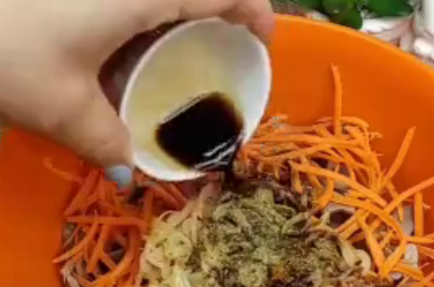 Складання салату. У глибокій мисці з'єднайте моркву, нарізані шлунки, обсмажену цибулю та подрібнений часник. Влийте соєвий соус і оцет, додайте приправу, поперчіть і за необхідності підсоліть.