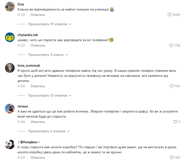 "Я проти збору телефонів, тим більше зараз. Повітряна тривога під час заняття, діти збираються в укриття. Хто віддає телефони? Це час. Телефон це мій зв'язок із дитиною".