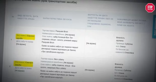 Згідно з деклараціями, дружина Суботіна володіє щонайменше 10 колекціями ювелірних виробів. Серед них — прикраси бренду Паскаль Бруні на пів мільйона гривень та коштовності від Carrera y Carrera вартістю понад мільйон. У колекції також є 15 елітних годинників від Ulysse Nardin і Chopard, щедро інкрустованих діамантами.