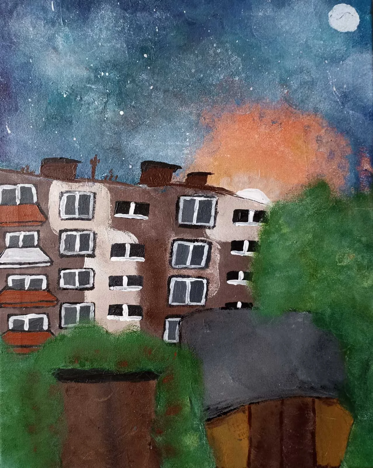 Зелену, синю, жовту, білу фарби купуємо їй часто, вони швидко витрачаються. На її малюнках майже немає чорного і червоного кольорів. На малюнках – небо, дерева, сніг, будиночки, не зруйновані війною. Вони не покинуті, у вікнах горить світло.