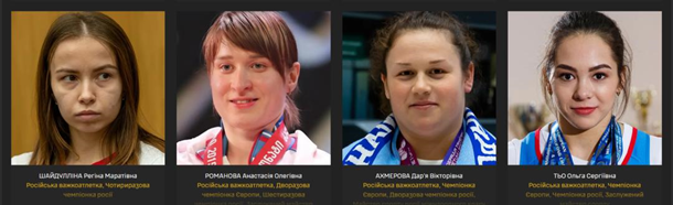 У списку також російські важкоатлетки Яна Сотієва, Регіна Шайдулліна та Анастасія Романова, які брали участь у тренувальних зборах на захоплених територіях України та були заявлені до складу збірної РФ на Чемпіонат світу з важкої атлетики 2025 року. Після офіційного звернення України Міжнародна федерація важкої атлетики не допустила до змагань цих спортсменок, а також ще 10 представників Росії та Білорусі.