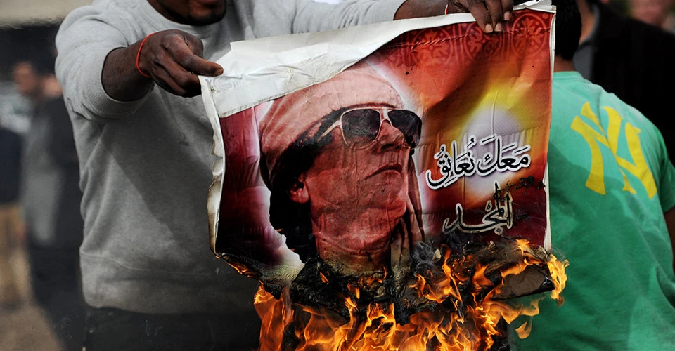 палаючий плакат лівійського диктатора Муаммара Каддафі під час протестів 2011 року, фото: gettyimages Вбивство КаддафіВранці 20 жовтня 2011 року загони Національної перехідної ради здійснили черговий штурм Сирта, внаслідок якого їм вдалося взяти місто.За деякими даними, Муаммара Каддафі намагалася вивезти з Лівії до Нігеру група південноафриканських найманців із 19 осіб за спеціально укладеним контрактом. Авіація НАТО відкрила вогонь і зупинила конвой із позашляховиків, іноземцям дали можливість втекти. При спробі вирватися з обложеного міста повстанці взяли Муаммара Каддафі в полон.Його відразу оточив натовп, який почав знущатися з нього. Люди з криками "Аллах акбар!" почали стріляти в повітря і тикати автоматами в полковника. Відеозаписи свідчать, що повстанці завдавали ще живому Каддафі численних штикових поранень по сідницях і сипали в рани пісок, одночасно підтримуючи колишнього лідера за прострілені в плечах руки. Наруги тривали з 9 ранку до 12 дня за місцевим часом, після чого полоненого на знак приниження протягли за ноги вулицями Сирта. У момент, коли Каддафі завантажили в автомобіль для транспортування до шпиталю, він уже не подавав ознак життя.Його син Мутаззим, згодом також убитий за нез'ясованих обставин. Відеозаписи останніх хвилин життя Каддафі, що з'явилися пізніше, спростували початкову офіційну версію Національної перехідної ради Лівії про випадкову загибель полковника в ході перестрілки. Стало ясно, що його було вбито в результаті самосуду повстанцями.Тіла Муаммара Каддафі, його сина та Абу Бакра Юніса Джабера були виставлені на загальний огляд у промисловому холодильнику для овочів у торговому центрі в Місураті. 25 жовтня всі троє були таємно поховані в Лівійській пустелі.На цьому закінчилося 42-річне правління полковника Каддафі та революція, яку він проголосив після повалення монархії у 1969 році.Після загибелі Муаммара Каддафі в Сирті було осквернено і знищено могили матері Каддафі, його дядька та ще двох родичів.