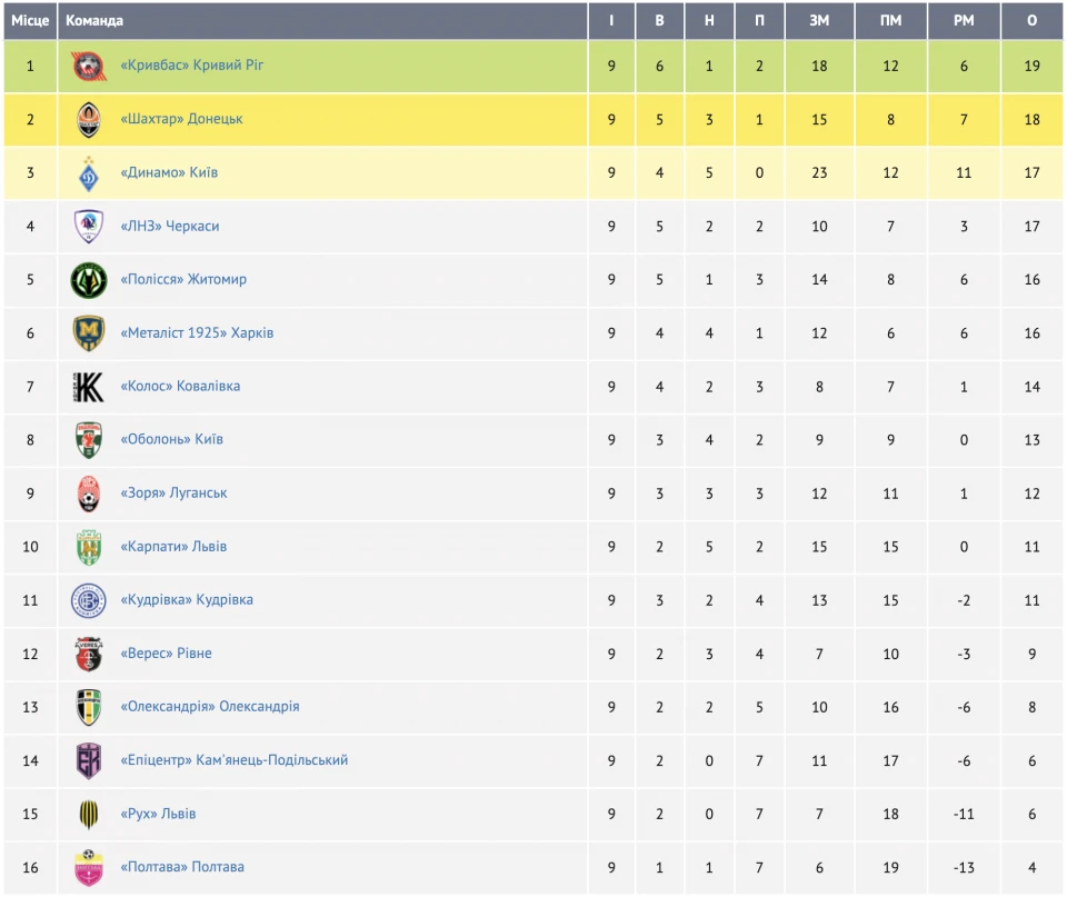 Про це повідомляє офіційний сайт Української Премʼєр-ліги.Після 9-х матчів новим лідером УПЛ став "Кривбас", який має 19 очок. Слідом йде "Шахтар" (18), "Динамо" (17) та черкаський ЛНЗ (17).У боротьбі за єврокубки також житомирське "Полісся" (16), харківський "Металіст 1925" (16) і "Колос" з Київщини (14).Останнє місце у таблиці займає "Полтава", яка поки має лише 4 набраних бали. Трохи краща ситуація у львівського "Руху" та "Епіцентру" з Хмельниччини, у них по 6 очок.Читайте також: Результати усіх матчів 9-го туру УПЛ