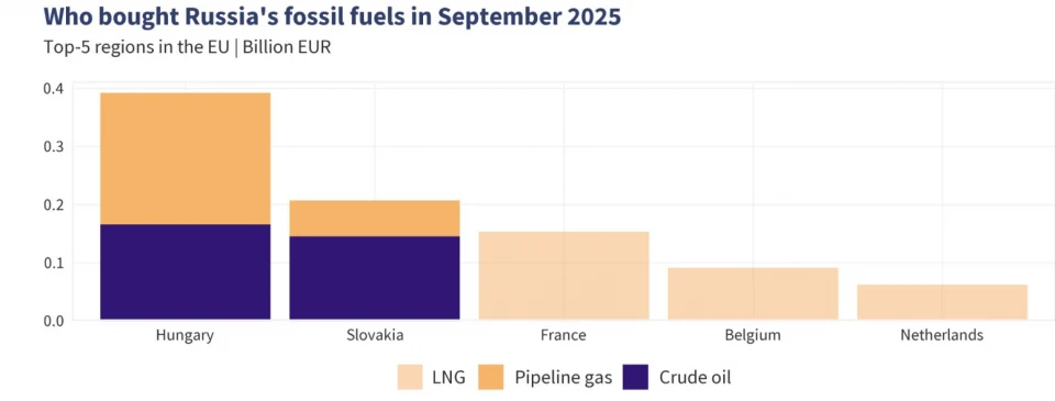 Міністри енергетики країн Європейського союзу 20 жовтня схвалили проєкт регламенту про поступову відмову від імпорту російського природного газу."Цей регламент є центральним елементом дорожньої карти ЄС REPowerEU щодо припинення залежності від російської енергії після того, як Росія перетворила постачання газу на зброю та неодноразові перебої з постачанням газу до ЄС, що мало значний вплив на європейський енергетичний ринок", – йдеться у повідомленні Ради ЄС.Нові контракти буде заборонено укладати уже з 1 січня 2026Запропонований регламент запроваджує обов'язкову поетапну заборону на імпорт як трубопровідного газу, так і зрідженого природного газу з Росії, з повною забороною, яка застосовуватиметься з 1 січня 2028 року.Імпорт російського газу буде заборонено з 1 січня 2026 року, зберігаючи при цьому перехідний період для чинних контрактів. Зокрема, короткострокові контракти, укладені до 17 червня 2025 року, можуть продовжуватися до 17 червня 2026 року, тоді як довгострокові контракти можуть діяти до 1 січня 2028 року.Також передбачено додаткові механізми моніторингу та оповіщення, щоб запобігти потраплянню російського газу до ЄС за транзитними процедурами (тобто газу, що проходить через ЄС в інші країни).Наразі текст регламенту остаточно не затверджений. Голова Ради розпочне переговори з Європейським парламентом з метою узгодження остаточного тексту регламенту після того.Які країни ЄС досі купують російський газЗа даними Центру досліджень енергетики та чистого повітря (CREA), ЄС досі входить у п’ятірку найбільших покупців російських вуглеводнів – після Китаю, Індії та Туреччини. При цьому, якщо трійка найбільших імпортерів імпортує насамперед нафту та нафтопродукти, то ЄС є найбільшим покупцем російського газу.Скажімо, у вересні 2025 ЄС викупив половину загального обсягу експорту зрідженого природного газу Росії (далі йдуть Китай – 22% та Японія – 18%), а також 35% російського трубопровідного газу (Китай купив 30% та Туреччина 29%). Загалом у вересні ЄС придбав газу у РФ на 743 млн євро та сирої нафти на 311 млн євро.При цьому зріджений газ в РФ купують насамперед Франція, Бельгія та Нідерланди, тоді як трубопровідний газ та сиру нафту – Угорщина та Словаччина. Безперечним лідером з закупівель російських вуглеводнів у Європі є Угорщина, яка придбала нафти і газу майже на 400 млн євро у вересні. При цьому саме Угорщина та Словаччина найбільше пручаються забороні на закупівлі нафти та газу в РФ.