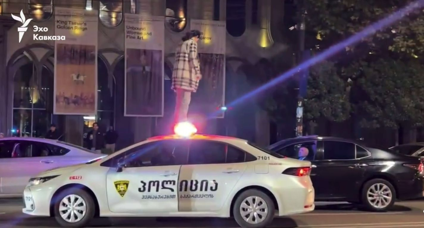Раніше одна з учасниць акції залізла на поліцейську машину. За інформацією з соцмереж, вона висловила підтримку засудженій журналістці Мзії Амаглобелі, яку у середу Європарламент відзначив премією Сахарова.