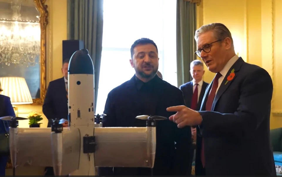 Зеленський представляє дрон-перехоплювач OCTOPUS британському прем'єру Кіра Стармеру (24.10.2025), фото: пресслужба президента Йдеться про спільну розробку українських та британських вчених, що розробили дешевий та компактний засіб перехплення ударних російських масивних БПЛА типу "шахед" чи "гербера". Фінансування проєкту й саме виробництво бере на себе Сполучене Королівство."Завдяки потужній оборонній промисловості світового рівня ми допомагаємо Україні відбивати варварські атаки російського диктатора Владіміра Путіна, одночасно створюючи робочі місця у Великій Британії, стимулюючи економічне зростання та забезпечуючи наше майбутнє. Це - реалізація нашого Плану змін", - сказав прем’єрміністр Британії Кір Стармер на зустрічі з Володимиром Зеленським у Лондоні в п'ятницю, 24 жовтня.Дрони OCTOPUS, ща словами британської сторони, вже успішно зарекомендували себе на полі бою.