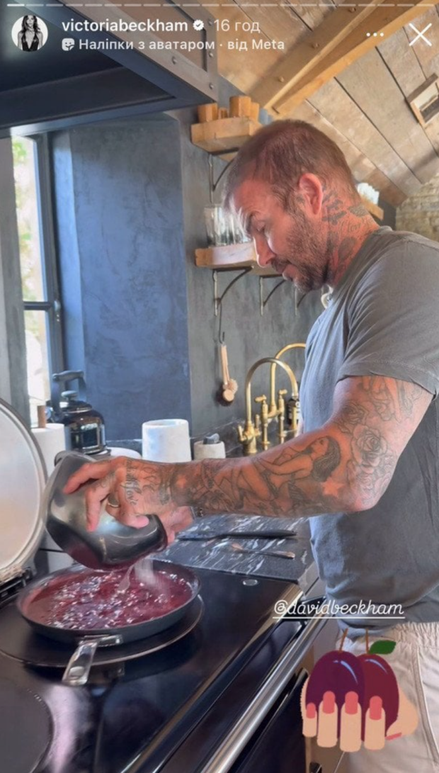 Нещодавно Вікторія Бекхем виклала у соцмережі відео, де її чоловік збирає сливи прямо з дерева, несе їх на кухню, варить джем і у фіналі трепетно демонструє банку з підписом: