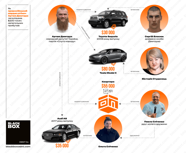 Схожа схема діяла і з житлом: у 2019 році він «орендував» квартиру, куплену його колишнім тренером Павлом Сліченком, а пізніше користувався Audi A8, оформленим на дружину Сліченка. Після втечі депутата родина Сліченка продала і квартиру, і авто, які, ймовірно, належали Дмитруку. Загальна вартість таких активів — близько 200 тис. дол., що значно перевищує його офіційні доходи.