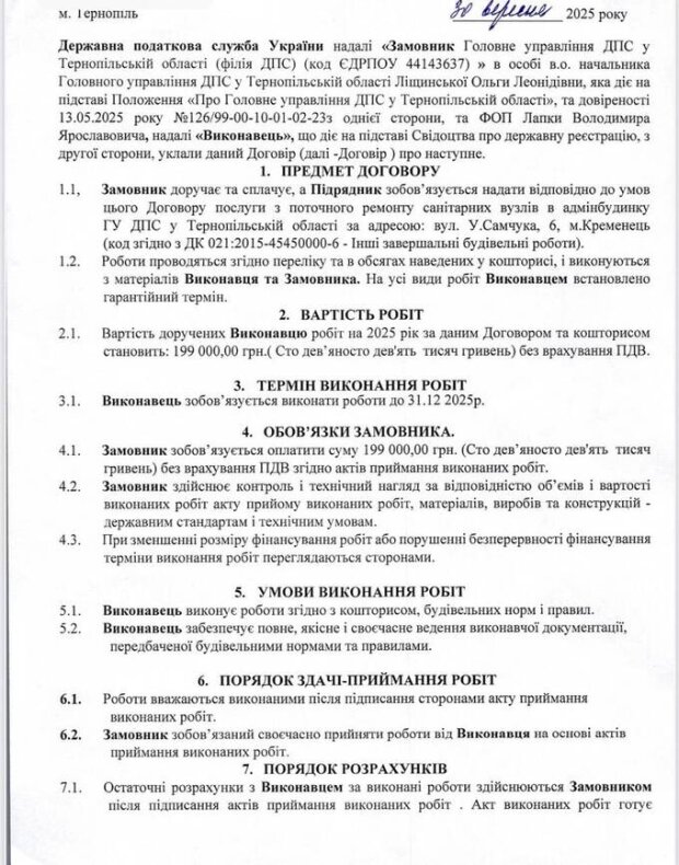 До справи Ліщинська підійшла із завидною серйозністю: крім свого підпису, під договором вона зібрала ще чотири. За умовами угоди, до кінця року Кременецька податкова інспекція отримає три оновлені санвузли. Вартість проекту — 200 тисяч гривень, що, за іронією спостерігачів, стало «вагомим внеском до інфраструктури та нових робочих місць».