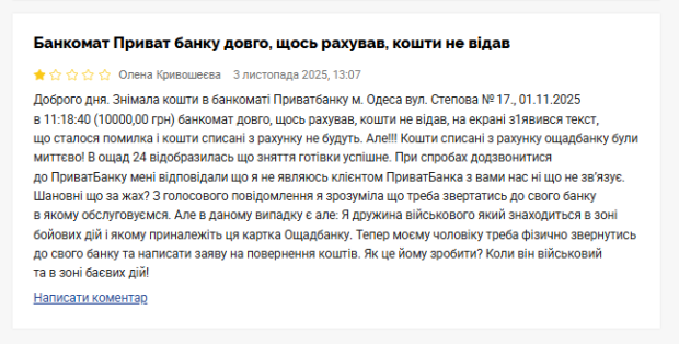 "Банкомат довго, щось рахував, кошти не видав, на екрані з'явився текст, що сталося помилка і кошти списані з рахунку не будуть. Але!!! Кошти списані з рахунку ощадбанку були миттєво! В ощад24 відобразилась що зняття готівки успішне", - поділилась українка.