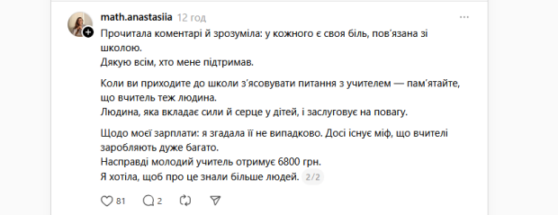 На закінчення Анастасія Журавель додала, що перечитала коментарі та зрозуміла, що ссі мають свій біль, пов’язаний зі школою. Пона подякувала тим, хто її підтримав.