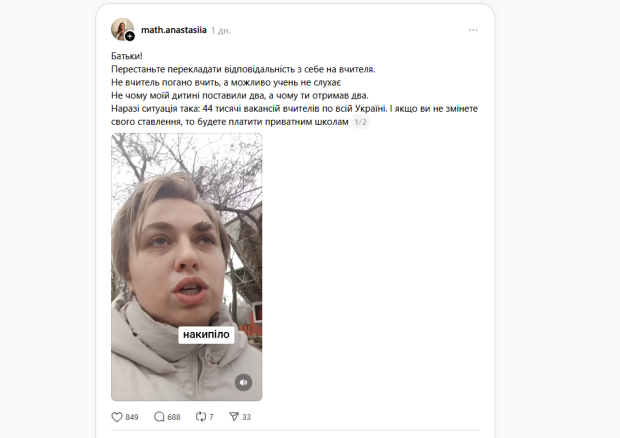 "Батьки! Перестаньте перекладати відповідальність з себе на вчителя. Не вчитель погано вчить, а можливо учень не слухає Не чому моїй дитині поставили два, а чому ти отримав два. Наразі ситуація така: 44 тисячі вакансій вчителів по всій Україні. І якщо ви не змінете свого ставлення, то будете платити приватним школам", - написала Анастасія Журавель.